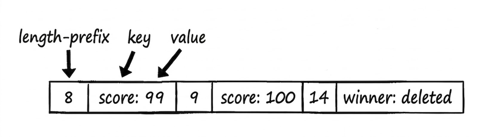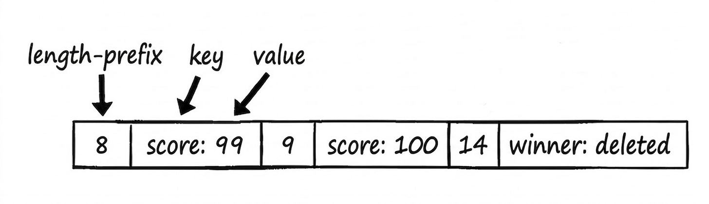 The format of the log file is simple: length-prefixed key-value pairs in little-endian binary. The length shows where the entry begins and helps the log reader know where the current record ends so it can parse the next record.