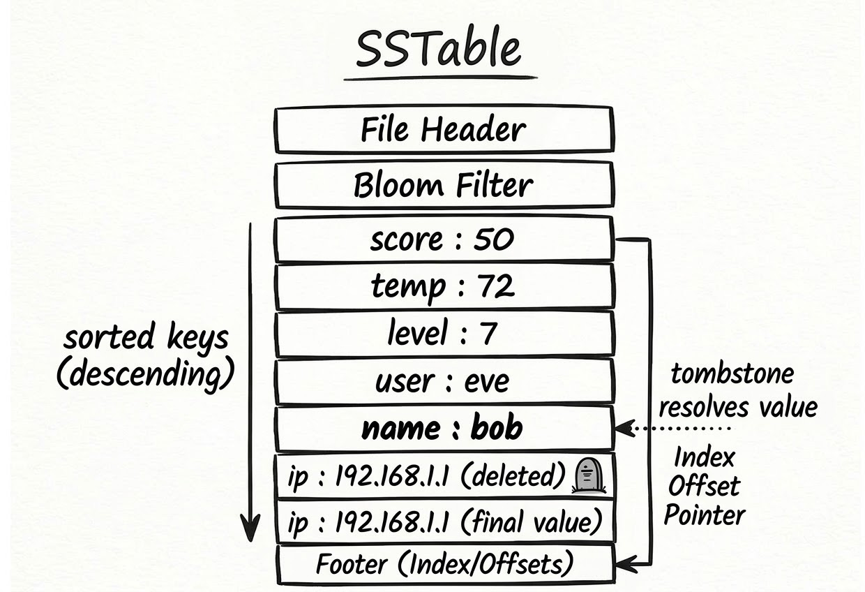 An SSTable is an immutable, sorted file. “Sorted” means the keys are written in alphabetical order, which makes lookups efficient: once you scan past the key you’re looking for, you know it isn’t in this file. “Immutable” means once it’s written, it’s never modified — no partial updates, no corruption risk.