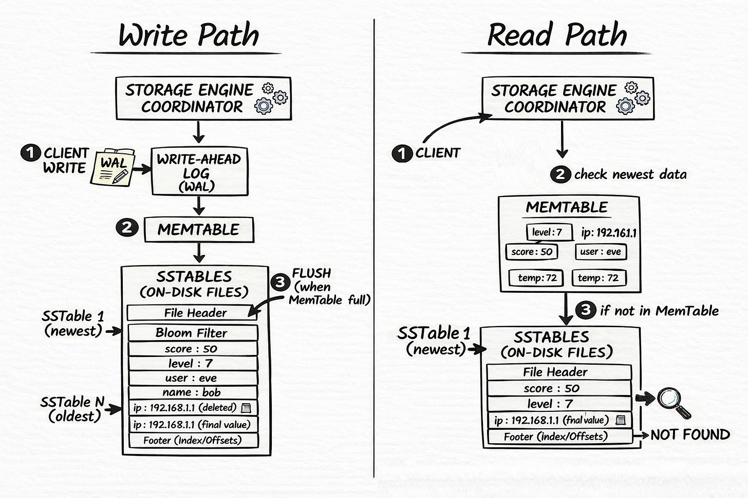 Write path: WAL (durability) → MemTable (speed) → SSTable flush when full.