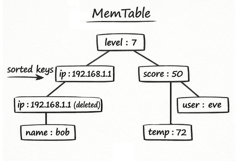 In youdaheDB, the MemTable is backed by Rust’s BTreeMap, which keeps keys sorted automatically. That sorted order matters for two reasons: it makes range scans efficient (searching by a prefix of a key), and it makes flushing to disk simpler because the data is already in the right order for an SSTable (sorted on-disk file format described in the next section).