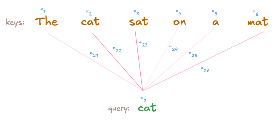 The query for ‘sat’ represents the kind of information the token is looking for. It computes a compatibility score with every other token in the sentence by taking the dot product between its query vector and other token’s key vector. Remember, each token has three corresponding vectors: key, query, and value. A high score between the query vector of ‘sat’ and the key vector of ‘cat’ indicates that ‘sat’ should rely heavily on the token ‘cat’ for its downstream tasks (whether next word prediction or machine translation).