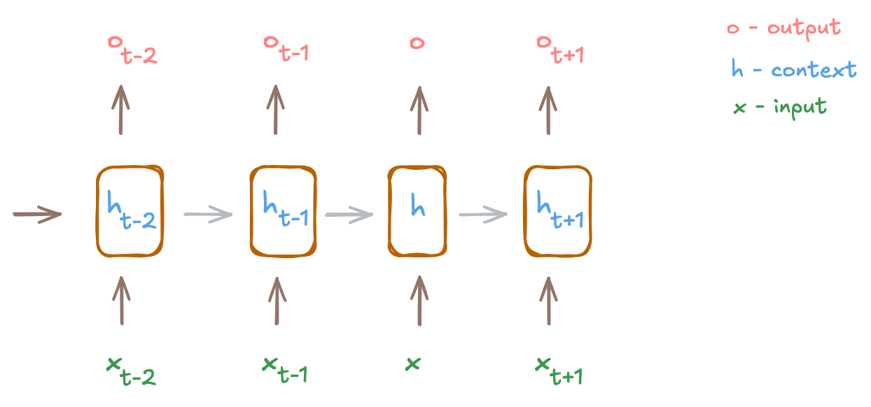 To explain this more formally (skip this paragraph if you’re allergic to equations), the context (h) is continuously updated as the model sees more tokens (x). At any timestep (t), an RNN has access to the current token (xt) and a context that summarizes all previous tokens (ht-1). This brings us to the core equation for updating a context at any timestep (ht):