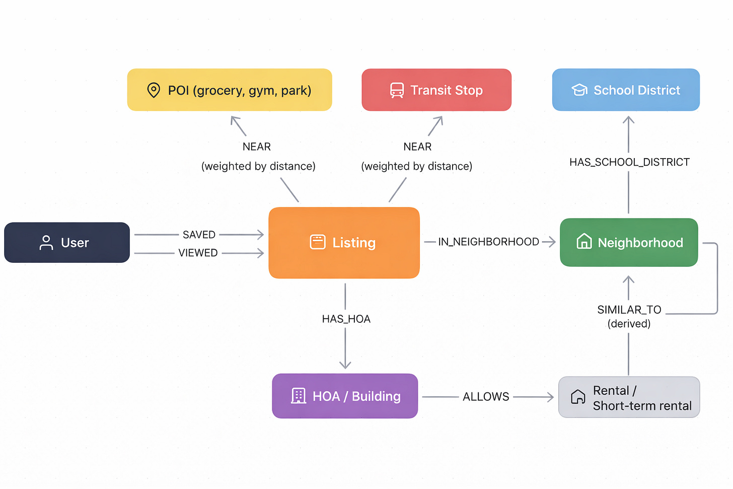 It supports cold-start: New listing? New user? Graph connections still provide signal: neighborhood, HOA, POIs, school district, comps.