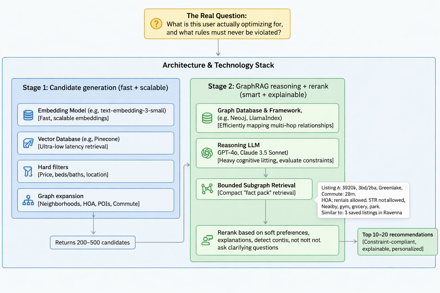 For each candidate (or the top 50), retrieve a bounded subgraph: neighborhood stats, HOA rules, commute time estimate, nearby POIs, similarity link to prior saved listings/neighborhoods.