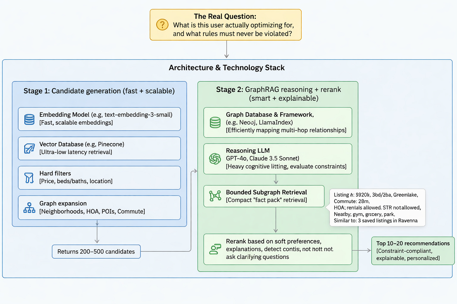 You end with top 10–20 recommendations that are constraint-compliant, explainable, and personalized beyond text similarity.