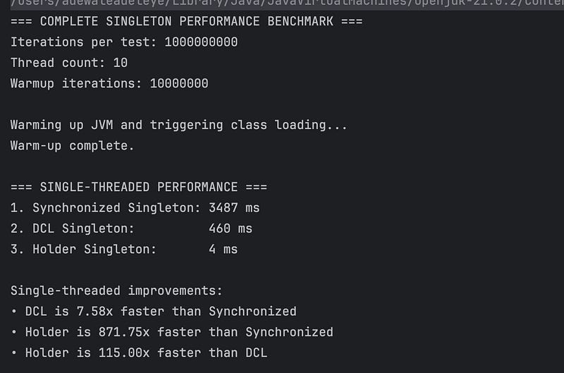 }The performance results are remarkable. In our benchmark, the Holder pattern reduced single-threaded access time to just 4 milliseconds, which is 115x faster than DCL and an astounding 871x faster than the synchronized approach. The JIT compiler optimizes this pattern to near-zero cost, essentially turning singleton access into a simple field read.